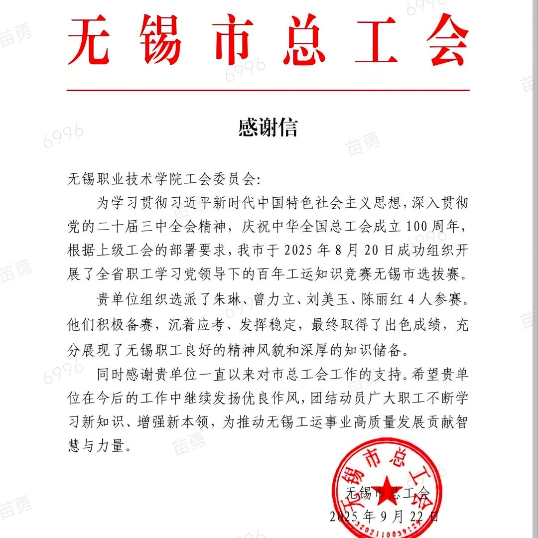 为学习贯彻习近平新时代中国特色社会主义思想,深入贯彻党的二十届三中全会精神,庆祝中华全国总工会成立100周年,根据上级工会的部署要求,无锡市总工会于2025年8月成功组织开展了全省职工学习党领导下的百年工运知识竞赛无锡市选拔赛,我校工会组队参赛。