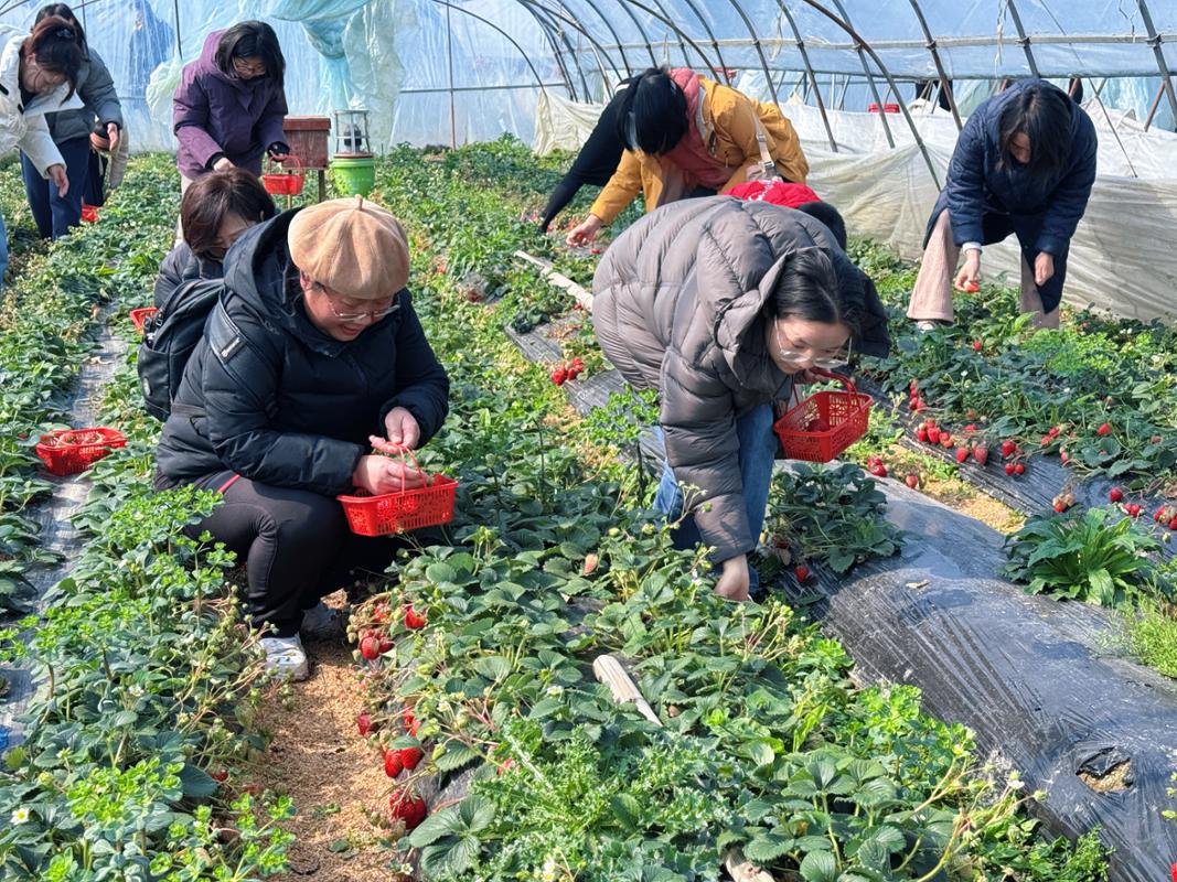 随后,大家来到草莓园,大家手持篮筐,穿梭于莓垄间,俯身挑选鲜红饱满的果实。暖阳透过大棚洒落,映照着一张张笑颜,平日忙于教学科研的老师们暂别案头,尽情享受田园野趣。镜头定格下温馨瞬间:满载的篮筐、沾泥的双手、分享果实的笑语……处处洋溢着轻松愉悦的氛围。