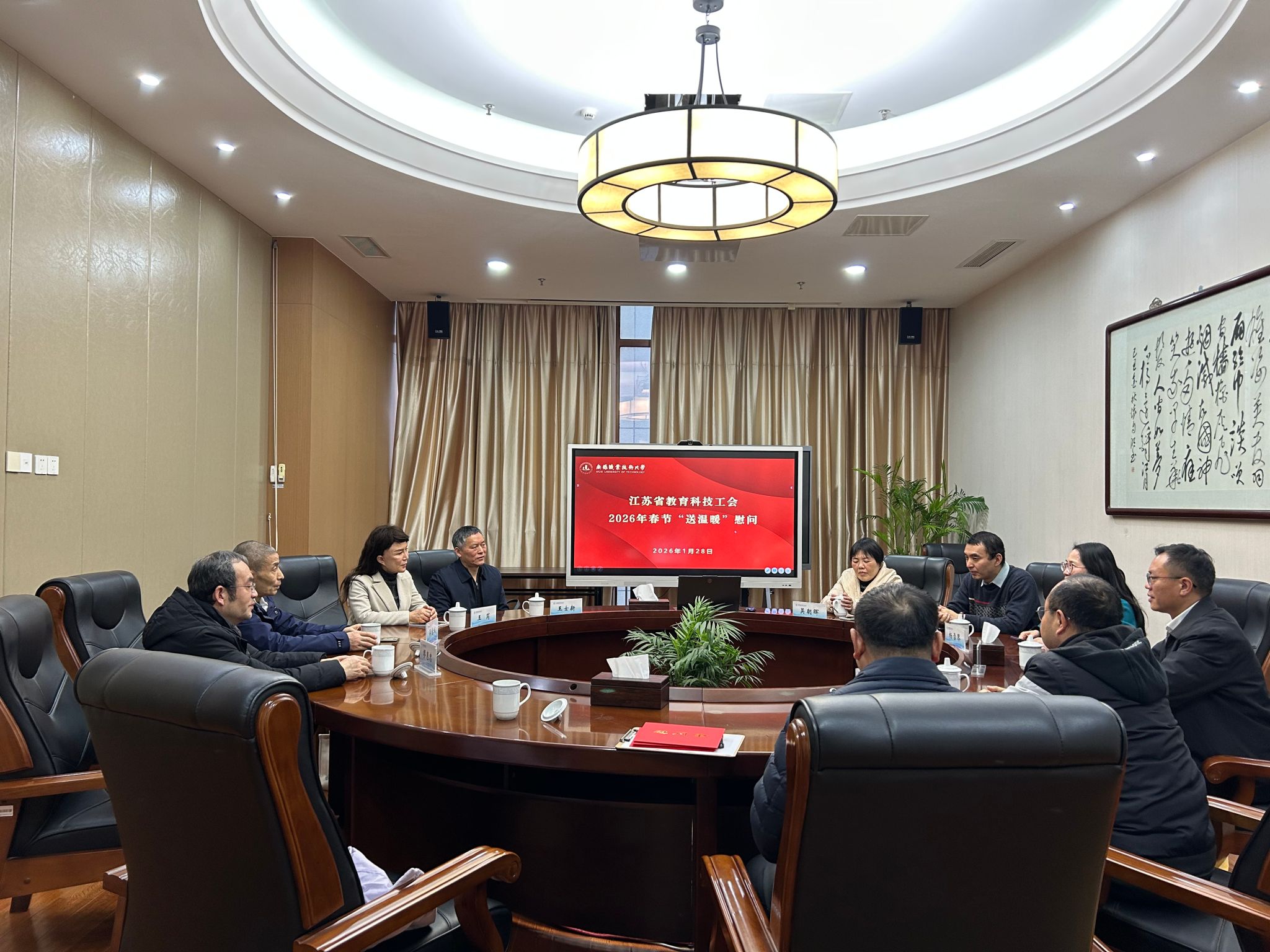新春佳节将至,暖意温情先行。1月28日上午,省教科工会科研院所部部长吴宝城、省教科工会办公室主任、女职委副主任王芮、无锡市教育工会主席缪惠忠等一行莅临我校,开展 2026 年春节“送温暖”活动,走访慰问我校困难教职工。党委副书记、工会主席杨雪琴、困难职工代表及校工会人员参加慰问活动。