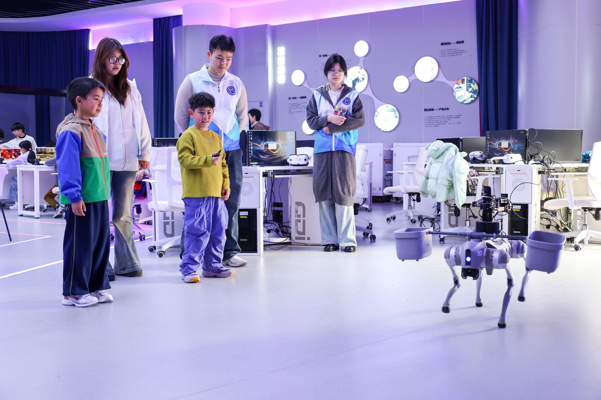 物联网学院举办的机器狗互动活动趣味十足,小朋友们手持感应笔于虚拟世界中充分展现自身能力。裸眼3D互动效果极为炫酷,笔尖划过,画面即刻呈现出 AI 画像。孩子们对科技的神奇之处惊叹不已,纷纷聚拢参与体验。活动现场洋溢着欢声笑语,也满含着大家对科技的无限憧憬。