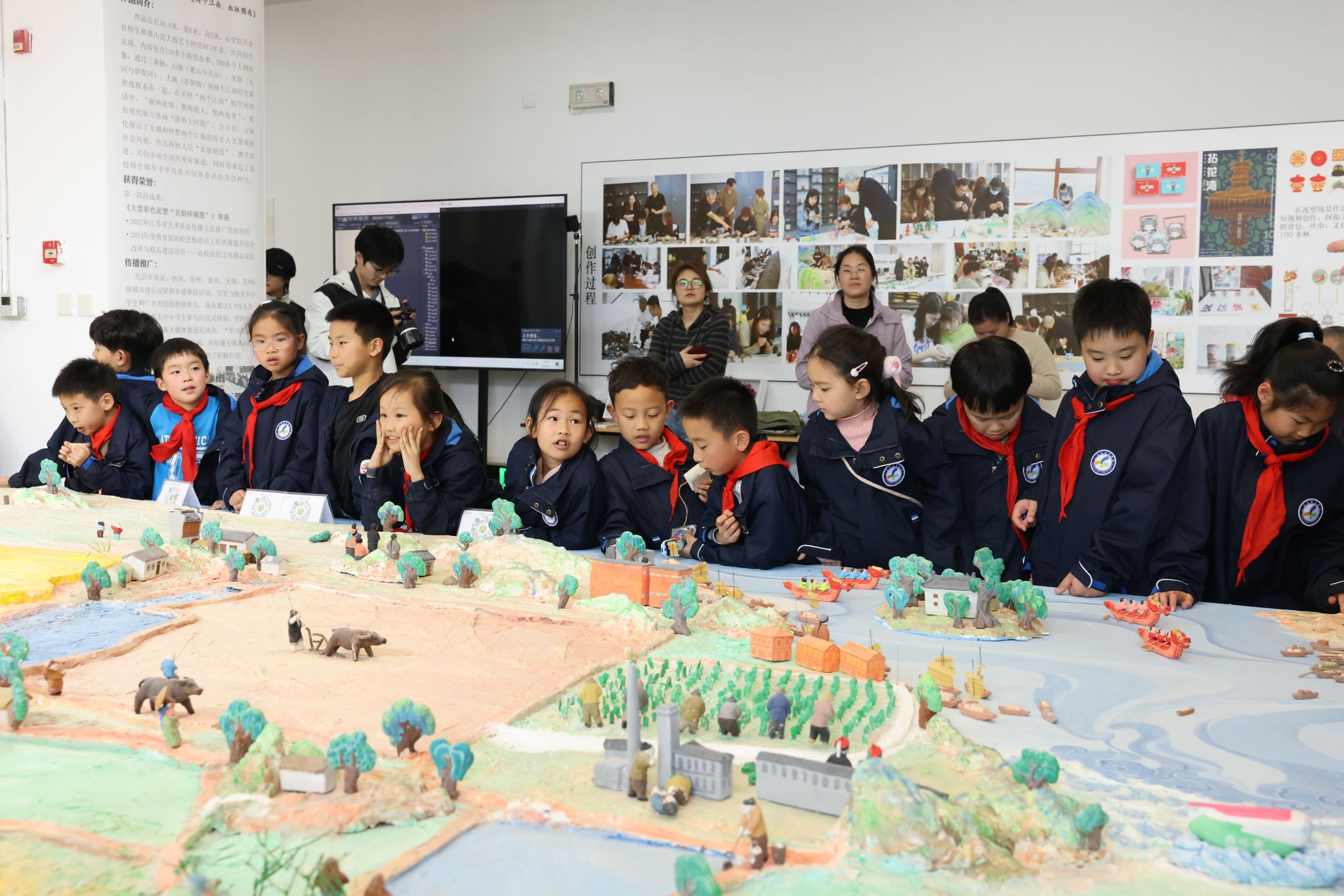 设计学院安排孩子们近距离观赏造型逼真的泥人,使其了解传统手工艺品所蕴含的精巧构思与深厚文化底蕴。同时,引导孩子们参与蓝染体验区活动,亲身感受非物质文化遗产的独特魅力。文旅学院组织引导孩子们参观院士馆,使他们学习榜样所蕴含的科研力量。